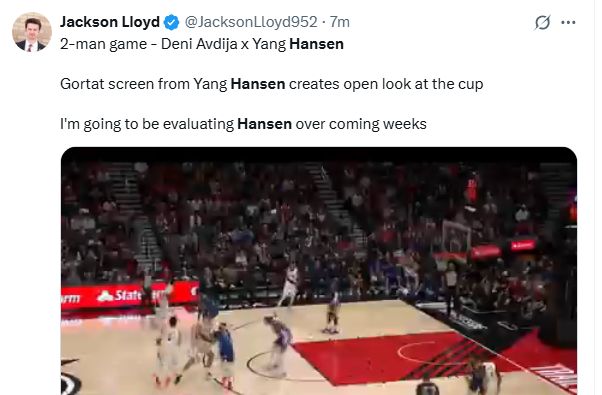 Jackson Lloyd:在比赛中,杨瀚森打出了一记类似马尔钦·戈塔特(Gortat)标志性的掩护 —— 通过扎实的挡拆为队友创造空间,最终帮助阿夫迪亚获得了直面篮筐的空位进攻机会,展现出他在双人战术中的配合价值。